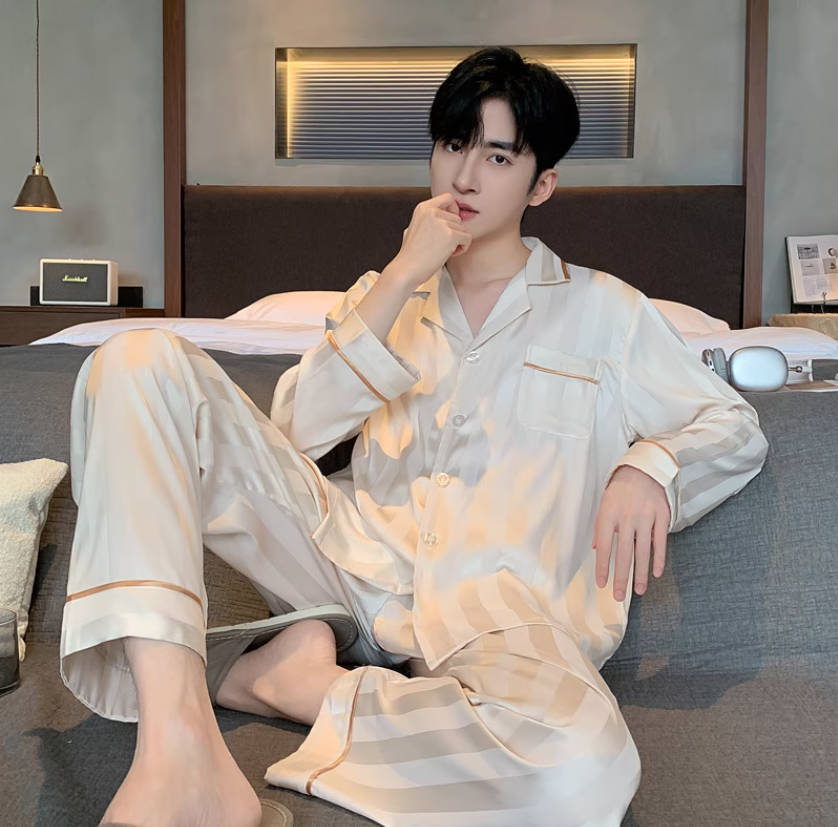 新款冰丝睡衣男春秋薄款大码宽松长袖家居服仿真丝绸夏季套装